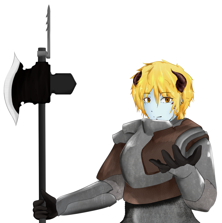 | 金髪の髪に琥珀色の瞳 角は、イラストどおり、頭の両側に二本ある。痣は左側にある。こっちはできるだけ髪で隠すようにしている 身長182cm 体重 79kg 口調は基本疑問系。だからと言って理解してないわけではない。 「目標としている人がいる(いた)」 兄 「未だ叶わない夢がある」 素敵な出会い 「異性の家族がいない」 母は自分が生まれる前に、落盤事故で死亡した 「家族無理矢理巻き込まれて」 兄が冒険者になると言い出し、それになぜかつきあうはめになった |