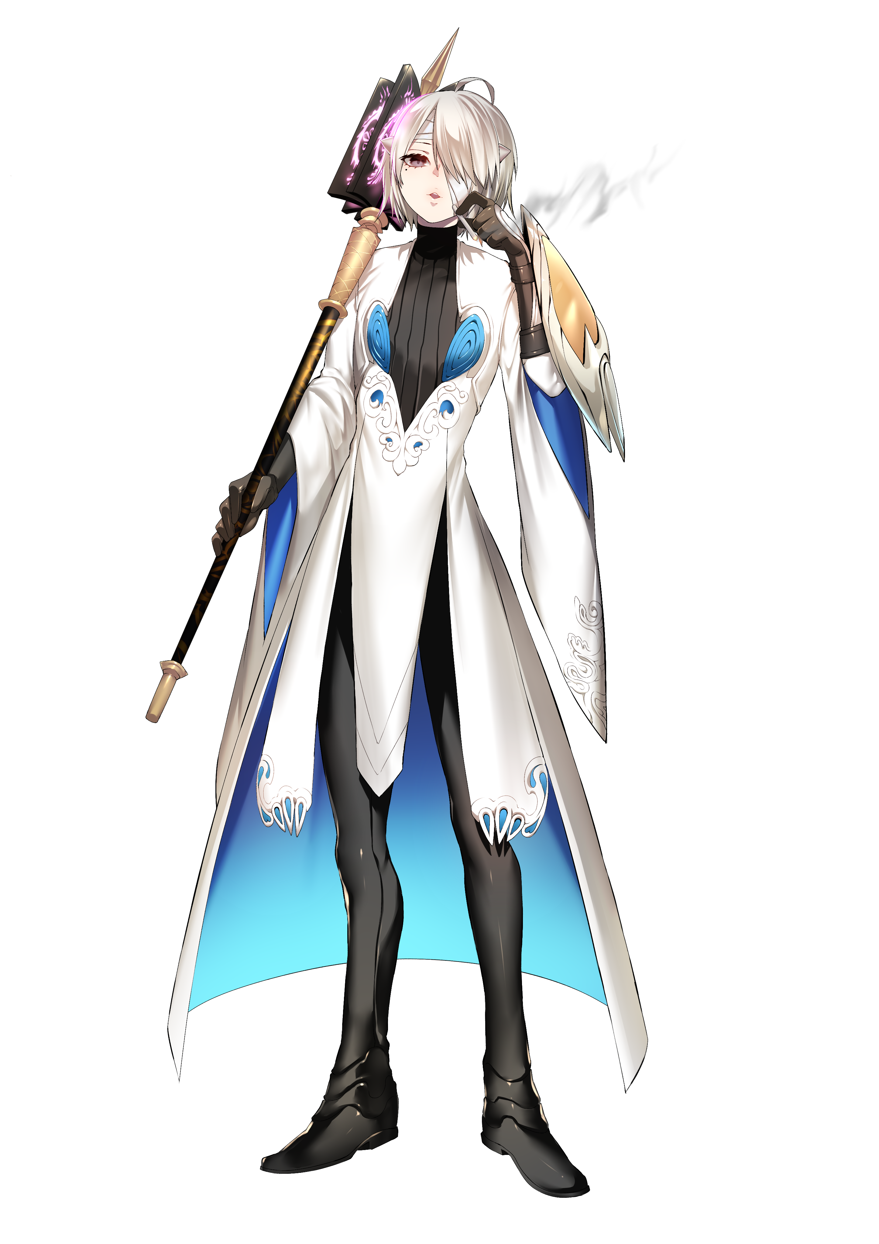 ・身長:157cm ・体重:51kg ・特徴:銀灰色をした髪と瞳に、フェミニンな印象の童顔。 背丈は低く、一見して未成年の人間に見えるが、その実高齢なエルフ生まれのナイトメア。 性差の曖昧な男性性に乏しい風貌は、幼少期の去勢施術による後天的な影響。 重度の愛煙家で、平時は巻き煙草を離さない。 |