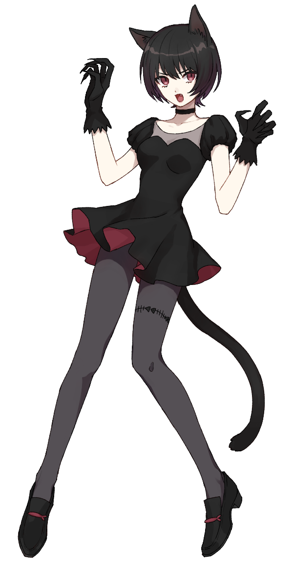 | 黒髪赤目の猫のリカント。成長期に栄養が足りていなかったので一部を除き全体的に細身で小さい。 背中に肩から腰にかけ大きな切傷がある。幼い頃につけられたものなので、成長と共に大きくなってしまった。 変貌すると頭が黒い猫に変わるほか、全身も毛が生え少しだが体格も猫っぽくなるので、大きな人に近い化け猫のような風貌になる。 聖剣伝説3の美獣の真の姿の、毛の濃さが変わらず骨格などが人に近くなったイメージ。 身長は155cm程度。不愛想で不器用な猫娘。心根はともかく言動は割とツンケン。 彼女が覚えている最も幼い頃の記憶は、幼い自分が誰かに抱き上げられ、幸せそうな男女に囲まれる。そんな記憶だった。 次に思いだせるのは、誰のものかもわからない血の匂いと、溶けるような痛みと、冷たくなった誰かの手。 あとは思いだしたくもない、嫌な記憶だけ。それが彼女の全てだった。 物心ついたころには、叔父と叔母を名乗る夫婦の元に居た。 何時両親でないことを明かされたのか覚えてもいないが、記憶に残らないくらい衝撃の一つも受けなかったのだろう。 彼らから愛情など与えられたことはなく、与えられたのは蔑みと暴力くらいで、心から笑ったことなど一度もない。 彼らは私を何故引き取ったのか知らないが、前に遺産がどうたらと聞いたような気もする。もうどうでも良いのだけど。 私が15になった時だ。巷では、誕生日と呼ばれる日。誰かに生まれたことを祝ってもらう日。 私にとっては、生まれた日というだけでしかない。ただその日は少しだけ違う日になった。 叔父と叔母にここを出て行けと言われたのだ。何でも、もう成人したのだから育てる義理もないとか。 べらべらと良く回る口で言うには、そういうことらしい。育てられた覚えなど無く、家政婦まがいのことをさせらたことしかないのだが。 とはいえ出て行けと言うなら出ていくほかない。ここは私の居場所ではないのだから。 小さな包みに収まる程度の私物を手に、どうしようかと途方に暮れているとふと昔のことを思い出した。 私の思いだしたくもない記憶の中の、一つか二つある綺麗な記憶。 この街に少しの間滞在していた、私と同じくらいの背をした、笑顔の冒険者の事。 何てことは無い。やることも無いから街はずれの木の上で寝ようとしたら、彼が先に寝ていて、慌てた彼が落ちたこと。 何となく会うようになって、少しだけ仲良くなって、教えてもいない誕生日に綺麗な服と靴を贈ってくれたこと。 そして、故郷に帰らなきゃいけないと、しばらくしたら街を出て行った事。 生きていた中で、楽しかった瞬間というのは、きっとあの日々を言うのだろう。 そんなことを思い出し、考えて。 私は冒険者になることにした。 彼にもう一度会いたいとか、そんなのではない。決してない。 ただ…………冒険者になれば、私も彼みたいに笑える日がくるのかもしれないと。そう思ったからだ。 |