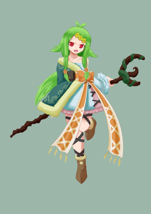 容姿 身長151cm。腰まで伸びた緑色の髪はひとつ結び、前髪は紐を二本使って花模様に編んでいる。肩出しのワンピースの上に、分厚い毛皮でできたコートを半分だけ着込んでいる。 足に交差するように巻いた黒のリボンと、腰に巻いたオレンジの大きなリボンがおしゃれポイント。 簡易説明 立派なドルイドとなるべく、過酷な環境であるブランブルグへと修行をしにきた人間の少女。自身家ゆえ少々頑固なところもあるが、自然を愛し万物に寄り添う姿勢もまた本物。食べ物には目がない。 ビルドは行使重視型のドルイド/コンジャラー。イメージで薬を捏ねることも少々。 経歴 「最強の存在になるため」小さい頃、ある本を読んだ。 それは、森の奥深くに住む森羅導師のお話。 人にも、動植物にも、あるいは穢れをもつ者にさえ、心を開き寄り添う姿に、ボクは憧れた。 「純潔である」 だから、ボクは導師となるべくバリバリ勉強を始めた。 友達と遊ぶことも、恋をすることもなく。 命と魂、輪廻について学ぶため、村に隠居する操霊術師の元へ押しかけたりもした。 これはこれで面白いんだけれど、ボクの夢はあくまでお話に出てくるあの姿だ。 「才能を絶賛されたことがある」 一通り独学での勉強を終えたボクは、知り合いのつてで森羅導師を紹介してもらった。 幸いなことにボクには才能があった。自然界の霊と心を通わせるのに、長い時間はかからなかった。 「役に立たない得意技がある」 けれど、大導師さまが言うにはそれだけでは駄目なのだという。 いわく、ボクには禁欲が足りないと。 アイスをコーン側から一滴こぼさず食べれるなんて披露している場合じゃないと。 結果、ボクはこのブランブルグへと放り出された。 アルフレイムの中でも激戦地の一つである過酷な環境の中で、いかに身を捨て隣人に尽くせるか。 ……うん、これも立派な導師になるための修行だもの。ボク、頑張るよ! その他 【名前について】スペイン語で「螺旋」。輪廻、蔓、DNAのイメージから。 【ビルド計画】