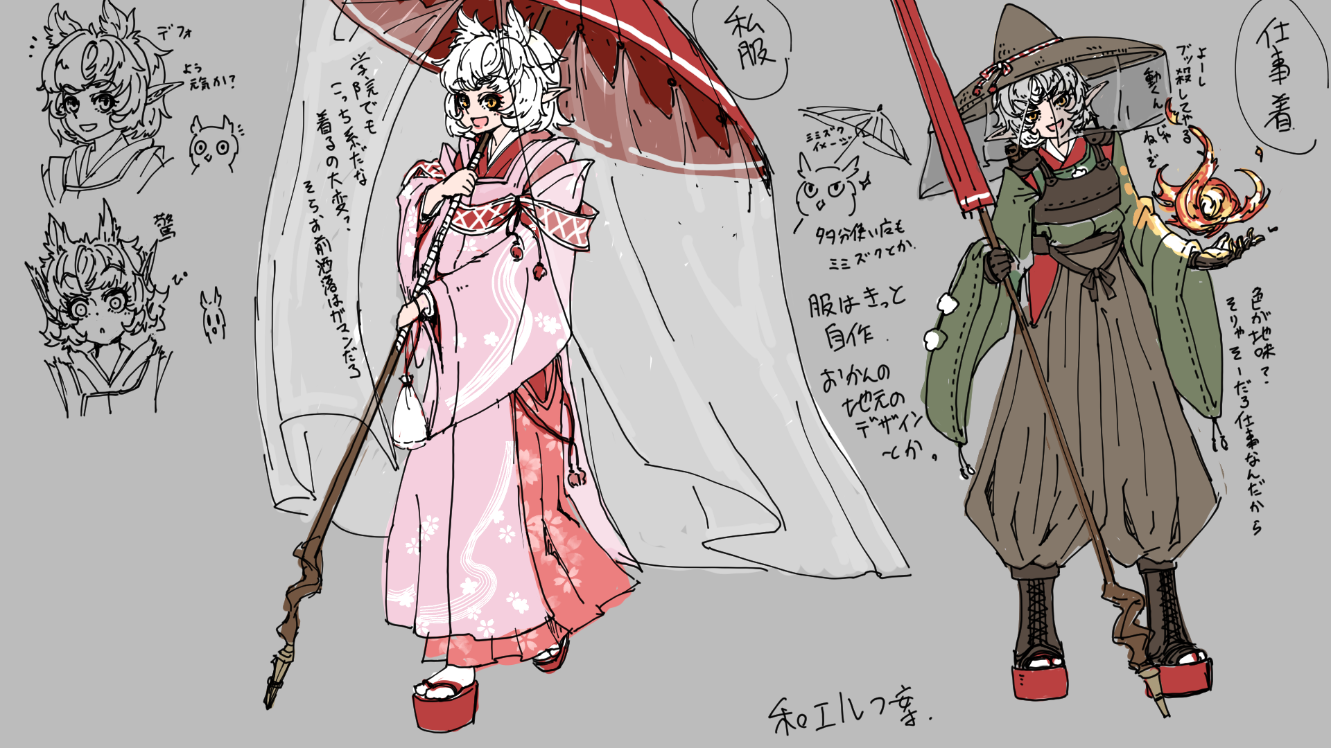 容姿 白金髪とか色々あるけどまあ白髪で良いだろ白髪で。白髪のくせ毛。目はまあ黄色とか橙とかそのへん。背は160ちょいってとこか。あと15くらい欲しいんだけどなー。冒険してたら背ぇ伸びねえかな。 スタイルぅ? あー、まあそこそこ良いんじゃあねえの。板でも西瓜でもねえ。 服は母さんの地元の意匠らしいぜ、行ったこと無いけど。洒落てるよな。 経歴・理由 「のめり込む趣味がある」「身体に傷痕がある」「求婚されたことがある」「探しているものがある」 略歴 生まれも育ちもブランブルグ、父さんも母さんも魔法使いで学院講師だ。名前は一応本名だから、好きに呼びな。父さんは海エルフ。母さんは人間で、なんか遠方の民族らしいな。んでどっちも頭が緩い。俺の名前だって色から好きなもん連想したらしいし。 両方ポンコツなもんだから家のことはだいたい俺がやってる。んで、母さんの頼みで服作ったりしてたけど、これが結構楽しいんだ。 ほら洒落てんだろこの服。俺の資金的に絹とかは無理なんで、私服は木綿だし仕事は麻だけど――いや俺の家庭事情はどうでもいいんだ。悪いな。 とにかく、それで俺もまあ両親を見習って魔術師になって、こっそり練習してて大怪我したりしてなー。母さんに泣かれt違う忘れろ。 こほん。んでまあ実地練習のためも兼ねて冒険者になったってわけだな。ヨシ。 ――捜し物? あー、うん。傷跡とか消せるアイテムとかねえかなー、って。 あ? 求婚? …………えーっと、んー……プライバシーってことで? |