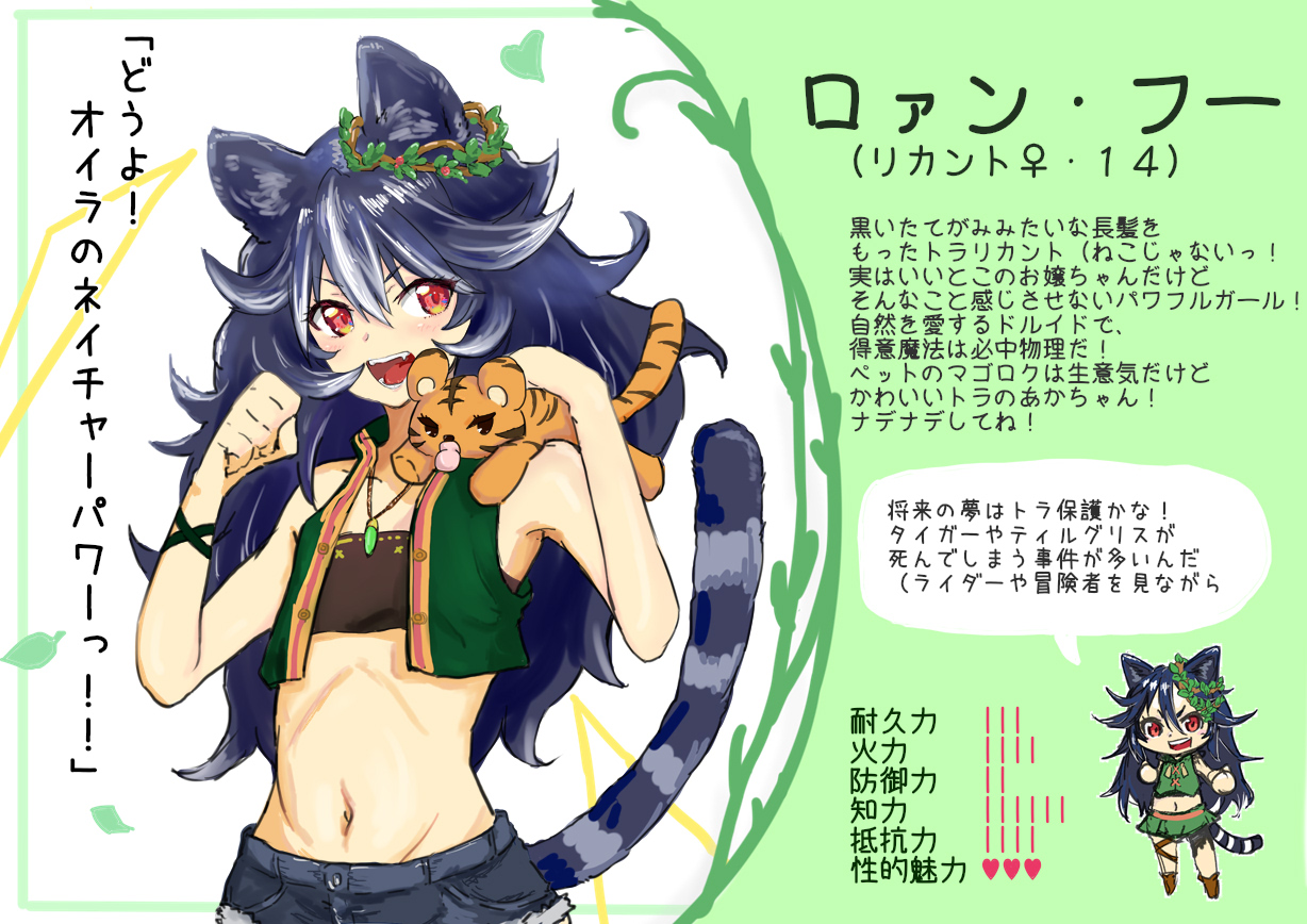 | 【容姿】 黒いタテガミのような長髪をもったトラのリカント。 黒を基調とした服を着るのが好きだがお目目は赤くピンクのくちびると合わせて結構めだつ。 八重歯なのもあり、すぐにかっと笑うためチャームポイントに。 【経歴】 「決して叶わない願いがある」→虎の王様になる!! 「まだ恋をしたことがない」→そういうのわかんない! 「大好きな食べ物がある(あった)」→お肉大好き!!!!!! |