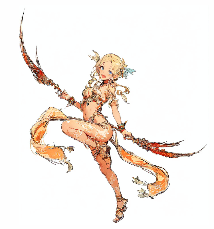 | ■物語 太陽は昇り、太陽は沈む。火輪を曳く双刃が、その理を象る。 焚火に照らされた少女の肢体は、囲む衆人に比して小柄だが。 剣舞の力強さ、躍動のしなやかさは、彼らに遜色ないものだ。 『どう?』と少女。『ないす!』と周囲。肉体言語であった。 ■人物 ソレイユ様式の軽装を帯び、双刃を携えた、ドワーフの少女。 太陽の刺青に彩られた褐色の肌、ふんわりした金髪、青い瞳。 性格はワイルドで開放的。普通の発話に不慣れなので、片言。 ■背景 旅の鍛冶師である母が、立ち寄ったソレイユの里に託した娘。 おおらかな偉丈夫たちに囲まれて、その文化の中で成長した。 天道の循環になぞらえた双刃の技を、奉納の剣舞として学ぶ。 そして、鍛錬を兼ねて、母の足取りを追うために、旅に出た。 ■経歴 生まれた環境:[流浪の鋳掛屋] 経験:[武芸を学ぶ][特別な師に出会う][絶技を身につける] ハプニング:[本当の親を知らない][異種族と恋をした][束縛されることがなかった] 冒険に出た理由:[探している人がいる] 信条:[自然:肯定][差別:否定] 矜持/執着:[自由を尊重する] |