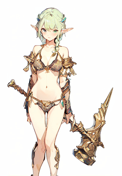 | ■経歴 [裕福な家に生まれた][純潔である][己に何らかの誓いを立てている] ■冒険に出た理由 [故郷を滅ぼされたので] ■人物 ビキニアーマーとウォーハンマーが特徴的なエルフの王女。 短く切り揃えたミントグリーンの髪、ライトゴールドの瞳。 水陸両方で暮らす文化で育ったため、水着が普段着である。 性格は真面目で清楚。先祖代々伝わる武器が重いのが悩み。 ■背景 エルフの都市国家ピアセレの王族。ノーブルエルフの末裔。 国を滅ぼした蛮族を討ち取り、故郷を再建することが目標。 そのためには何よりも、己自身が強くならないといけない。 かつては長かった髪を、その決意の証として、断ち切った。 正式名称プリステポモイデス・ア・ピアセレ。亡国の姫君。 |